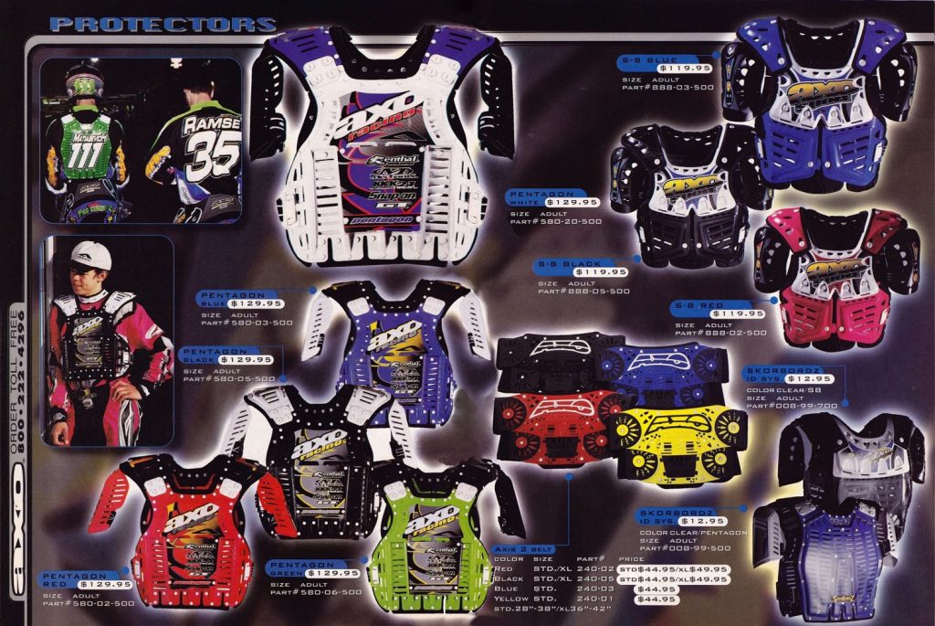 Blaze: One of the significant additions to the AXO lineup for 1990 was the all-new Pentagon chest protector. The Pentagon was the brainchild of AXO of Italy founder Remo Berlese and took its name from the five possible configurations its interchangeable sections allowed.