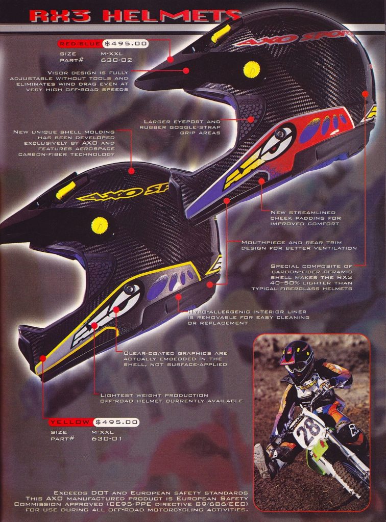 Blaze: The sole product in the AXO lineup for ‘99 that still interested me was the badass RX-3 Carbon helmet. The graphics weren’t great, but man that exposed carbon fiber was sexy.