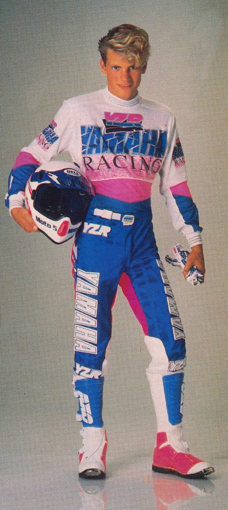 Blaze: AXO’s Yamaha-branded YZR gear was back for 1990 and just as unappealing as the year before. Nice hair, bro…