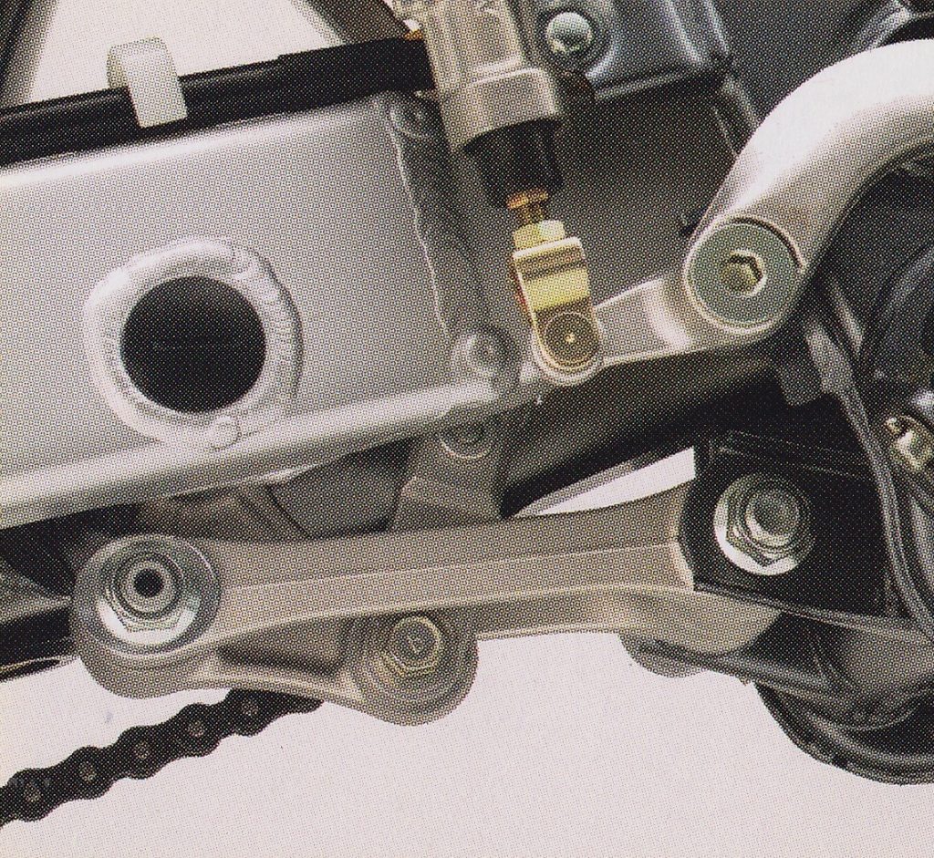 A new Uni-Trak linkage for 2004 repositioned the mounts from the frame to the swingarm to reduce fore-aft movement of the shock as it moved through its travel. Photo Credit: Kawasaki
