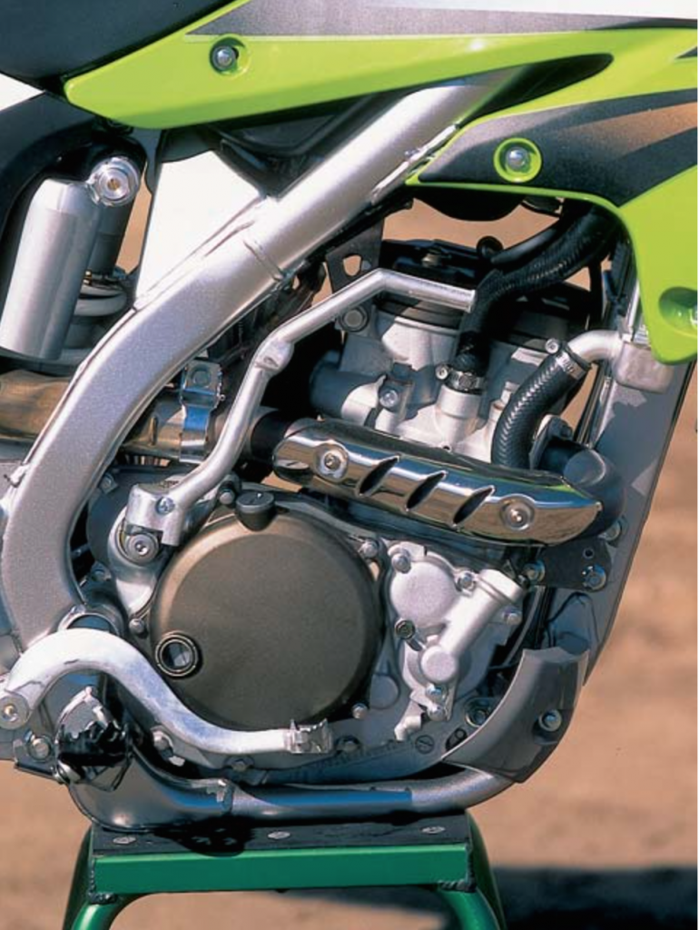 In the chassis department, Kawasaki chose to stick to what they knew by dialing up a twin-spar steel perimeter frame very similar to what you could find on their KX125 and KX250 two-strokes. Overall chassis dimensions were unique, however, and the new frame featured special “D-section” spars on the top to narrow the layout at the seat-tank juncture. The bottom of the frame was also slightly narrower, with the footpegs mounted 3mm higher than on the KX250 to improve cornering clearance.