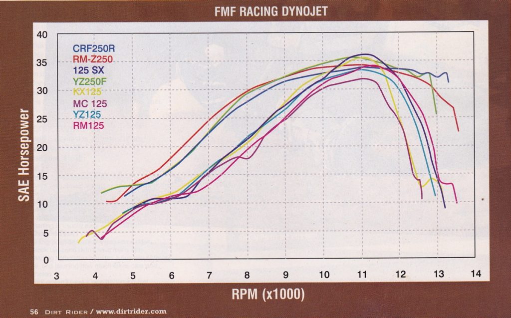 As this dyno chart reveals, all of the RM-Z’s (and KXF’s) power advantage was in the lower portion of the powerband. Once past the midrange, the YZ250F and several 125s pulled ahead. Photo Credit: Dirt Rider