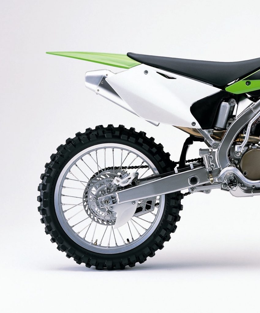 Out back, Kawasaki once again enlisted Kayaba to handle the shock duties (Suzuki’s RM125 and RM250 used Showa components in 2004). The single KYB damper offered 12.2” of travel and 16 adjustments for compression and rebound. Unlike previous KX models, which anchored the linkage to the frame, the new KXF (and RM-Z) moved the linkage anchor point to the swingarm. This was done to reduce front-to-rear movement of the shock and increase traction and stability under power.