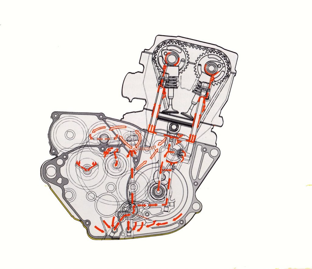 The advantage of this system was that it allowed Suzuki to place the crank very low in the motor (to keep rotating mass as low as possible), while not suffering the typical pumping losses due to the crank being bathed in oil. By using a scraper and a scavenging pump, engineers were able to keep the crank free of excess oil and allow it to rev more freely. The new motor also saved weight and reduced complexity by doing away with external oil lines in favor of internal oil passages and hollowed-out bolts that doubled as carriers of oil to the head.