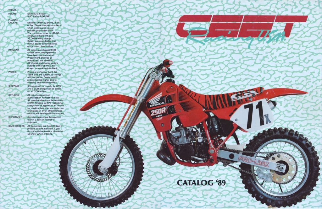 Ceet Racing’s second big product was a vinyl cover for your bike’s gas tank. Today, this sounds ridiculous, but at the time, OEM decal life was all but nonexistent. The transition to plastic tanks and crude decal technology meant that most stock graphics only lasted a few rides. To combat this, Ceet developed a fitted cover that matched the OEM color and simulated the graphics. Up close they were a little cobby, but from a distance, they looked better than a bald and beaten tank.