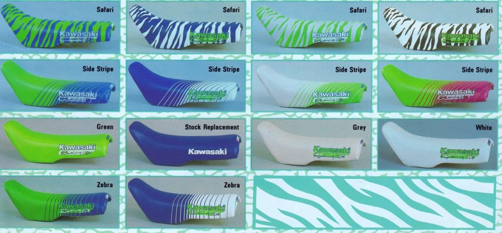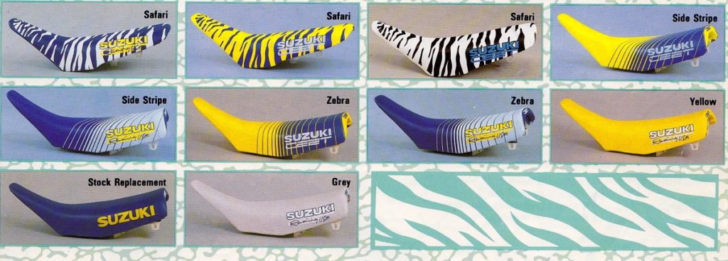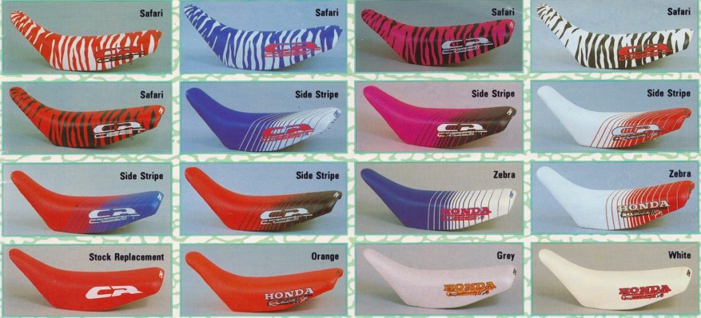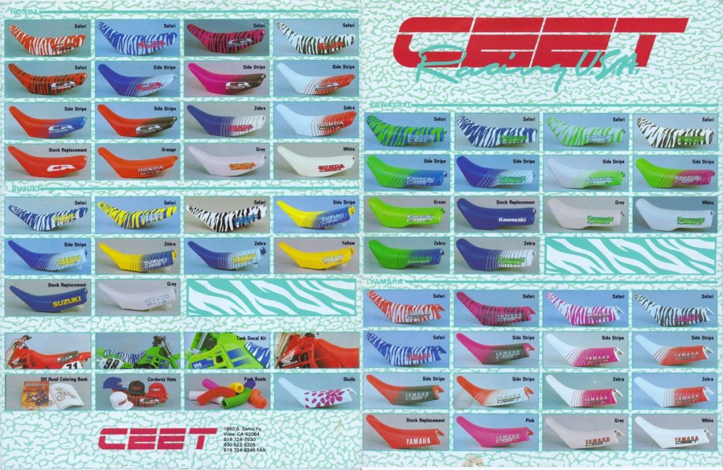 About the same time that JT Racing and Fox Racing were adding Dalmatian spots and zebra stripes to their pants, Ceet Racing got the bright idea to do the same to seat covers. At the time, aftermarket graphics were not yet a thing, so dialing up a crazy seat cover was the easiest way to really set your bike apart from the crowd. It may look silly now, but I am telling you that in 1989, showing up with a Safari seat on your new RM125 was like rolling up with full Pro Circuit A-Kit suspension on your KX250F today.