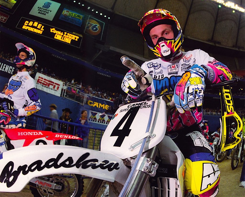 This is ’92, which was the year that Bradshaw was basically dominating, and this was at Seattle supercross. With everything that I was doing, I was really starting to get into getting more personality out of the riders. So this was a good opportunity because he’s sitting right there next to Stanton. I was sure he was going to win the supercross championship that year. He was killing it. Damon hated MXA. He knew I worked for MXA. MXA didn’t like him either. I’m like, “Damon, give me a number one.” He’s all, pfft. Then he does it and I’m like, “Yes!”