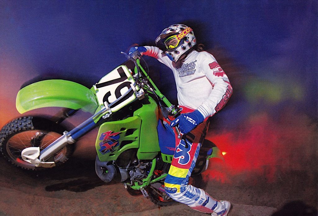 This is Mike Chamberlin. My flash photography is evolving at this point. There’s a KX500. I don’t know why he’s wearing Surf pants. Maybe Jody was trying to help (Jeff) Glass by using some of that gear in the magazine on test bikes and stuff like that, giving Glass a little more added value.