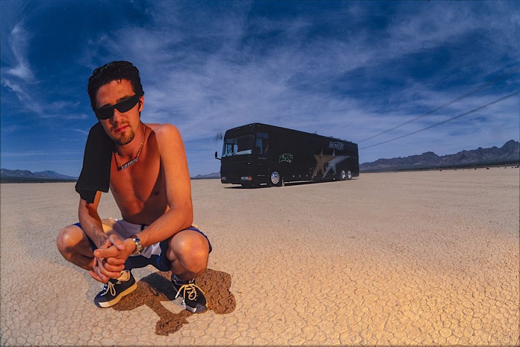 We took the bus to Las Vegas for the World Mini. This was on the way back. On the way there, we’d go from California to Nevada right there and there’s that big, dry lake bed. So it’s right around Primm. I think it was right at Primm is where we got on the dry lake bed. Tim Dixon was driving the bus. So we stopped and shot these photos. Then I said, “Dude, it would look really cool if you got on top of the bus and drove around.”