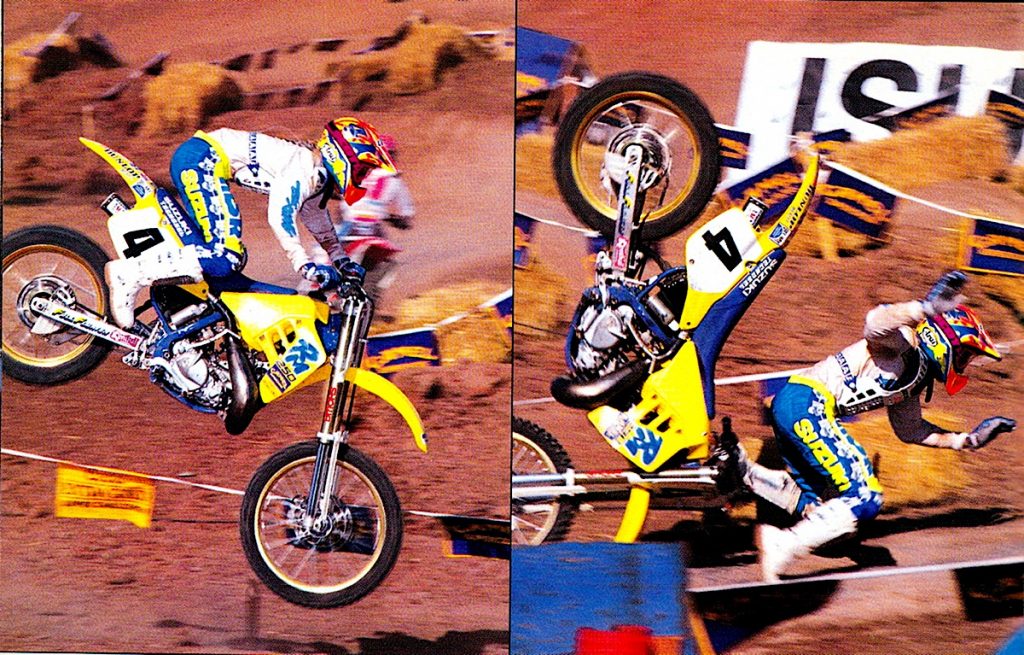 So, Guy Cooper was one of my favorite riders. I was always a big fan of his. I really wanted him to win a supercross race. In 1990 I think he could have won. He was leading. It was a daytime supercross. It was super hot. He’s hauling ass and he’s coming through this whoops section so fast, and every lap he’s getting faster, and every lap he’s getting faster. I was like, he’s going to wad up. I could see it coming. I knew it was going to happen and I felt horrible. It was Oklahoma. It was his hometown. He was leading the race. He was over the edge. I knew it was going to happen and I knew where it was going to happen, so I’m like, “Well, it’s going to happen so I’m going to shoot it.” So I camped out in the whoops and I only had to wait two more laps. He came through, lost the front end and just cart-wheeled. It was actually a four-shot sequence, and I was shooting with that big, long lens flash thing again, but the flash only went off the first two times. The other two photos kind of sucked. So that’s like the only time I have ever purposely set up in a place to shoot a crash photo.