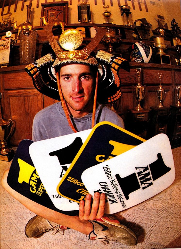 This is Jeff Stanton with a samurai helmet that he won at Tokyo. So this is ’92. To me, that photo kind of embodies the whole season. This is at his house after Red Bud and this is Fourth of July. We had just gotten done drinking a bunch of beer and letting off fireworks out in his pasture. So he took us into his house and showed us his trophy room. I’m like, “Oh my god. You got to put on the samurai helmet.” So he does. I’m all, “Sit down.” I’m totally in my creative element right then.