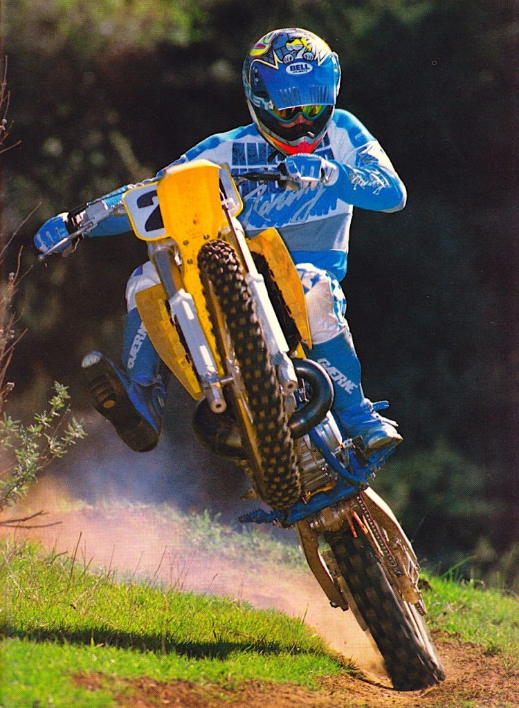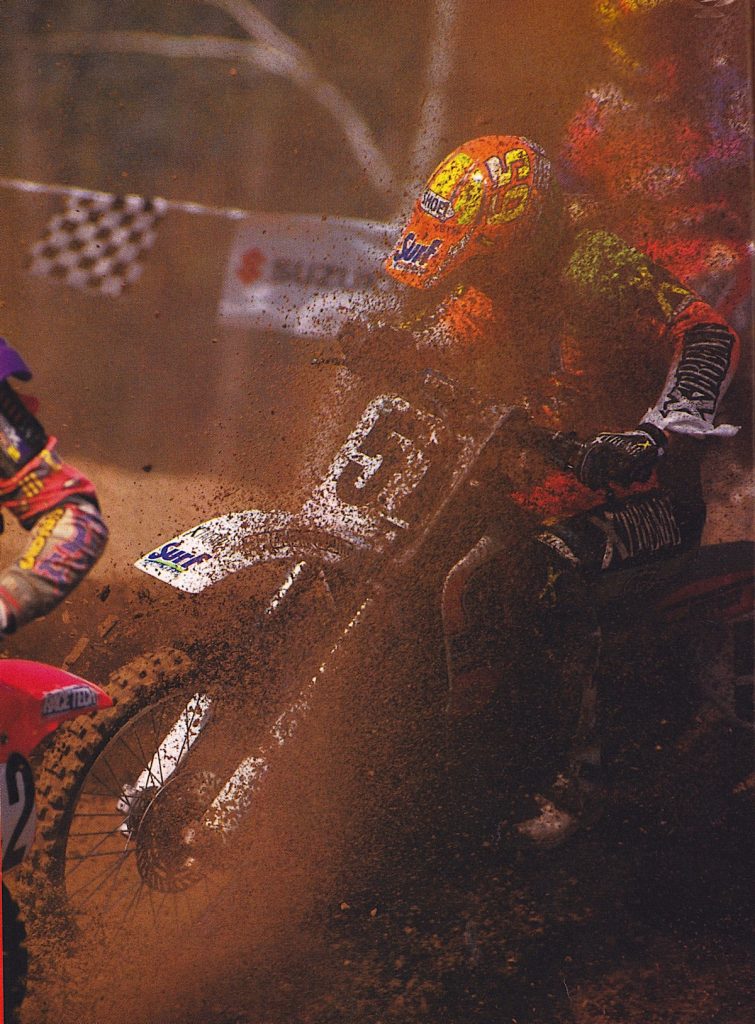 My relationship with Surwall actually went pretty far… When I was still doing the amateur magazine, he was sending me to races and stuff to shoot catalogue stuff for him. Whenever I did anything, I’d always send it to him. The funny thing about that photo is actually Simon Cudby got pretty much the same exact photo and it ran on the cover of Racer X. This photo in the same issue ran as a two-page spread in Racer X. They’re pretty much identical.