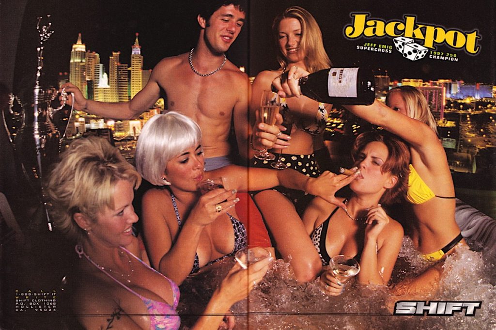 So I was like, “Remember that scene in Rain Man when they’re standing in these big, giant windows and there’s strippers in the background, there’s a big, luxurious hot tub? We got to get a hot tub, a suite like that, then a bunch of chicks.” He’s all, “That’s a great idea.” So I left and went to Vegas because we were doing other video projects too while we were out there. Then the supercross rolls around and the day of the supercross Pete’s all, “I got a room. It’s at the MGM, and they have hot tubs, but they’re getting rid of the hot tubs so the heat hasn’t been turned on.” I’m like, “Okay, we can make it work. No problem.” So they were shooting Fresno Smooth at the same time, so you were at the party then. You saw all the things that were going on at the party.