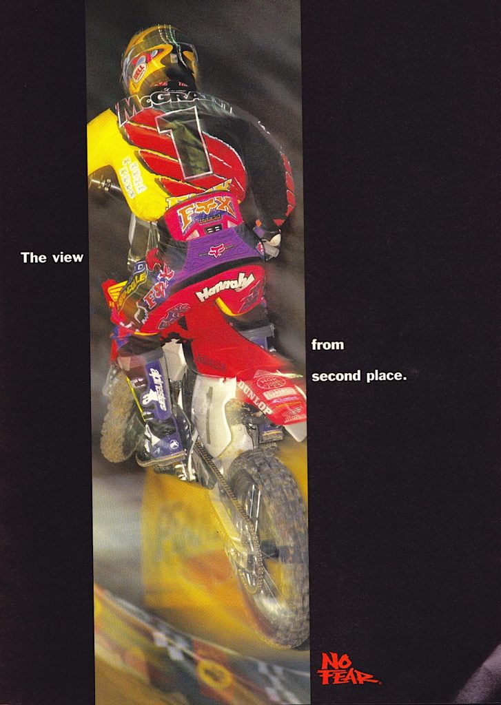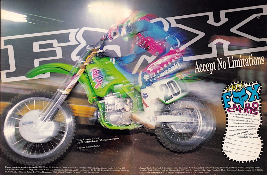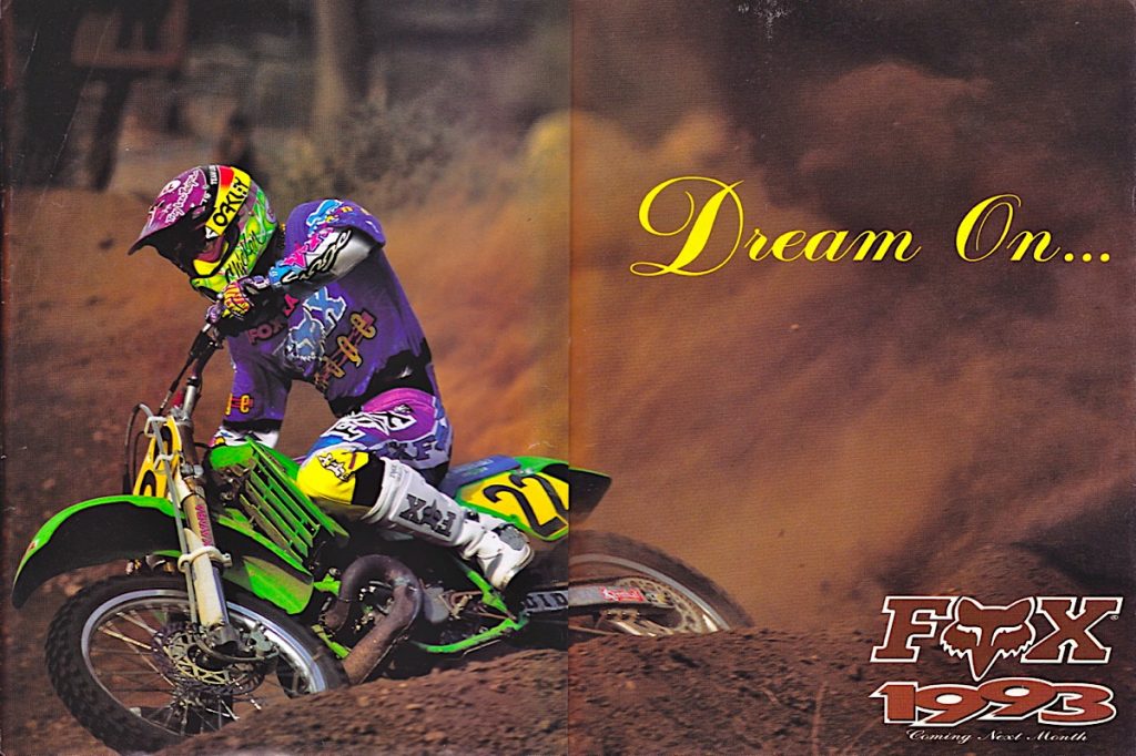 The Dream on Fox campaign was epic for sure. The first one, from Hollister, one was actually Pete’s (Fox) because they were out there doing a gear session or something and had Robbie Reynard out there and he was just standing on the hill overlooking the track at Hollister and grabbed that photo himself. It was interesting because really nobody back then was doing any kind of image advertising. Pete was very forward-thinking and one of their slogans was “image is everything.” He kind of took that literally and ran with it further than anybody. His vision in his advertising back then was just insane. I was just actually starting to be able to contribute to that and help Fox with getting images for the Dream On campaign. For me, that was a huge thing.