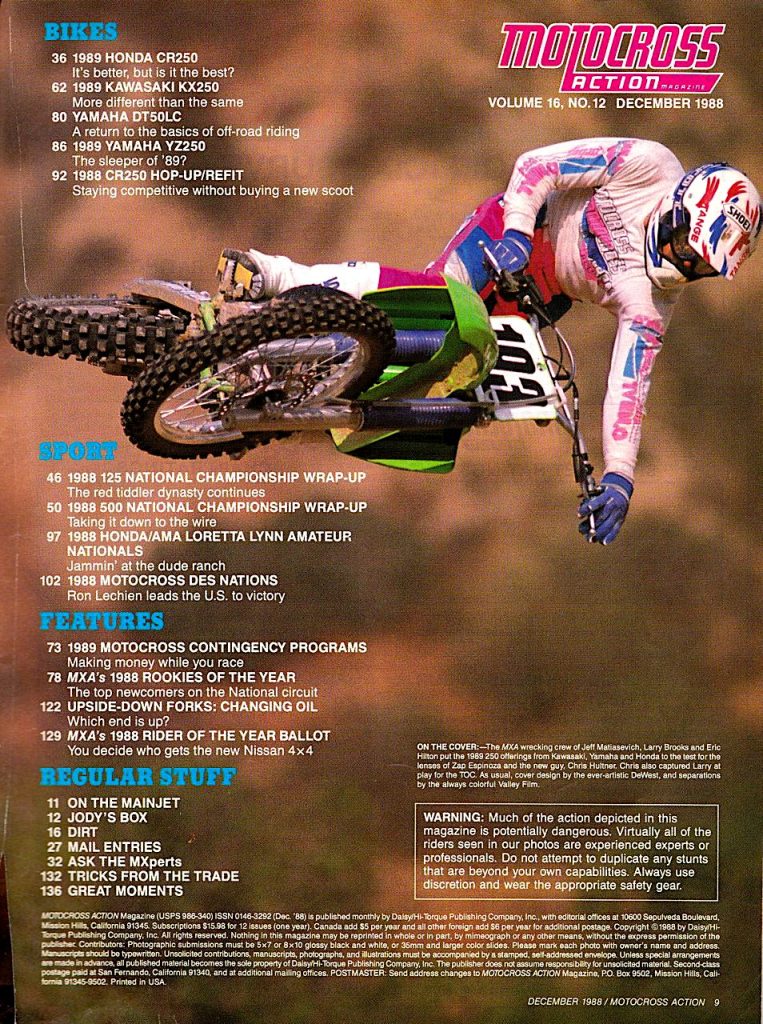 This is Larry Brooks out at DeAnza. When I started at High Torque it took Jody a little while to warm up to me because Eddy (Arnet) hired me. So, this was actually the first shoot that I went on. I was High Torque staff photographer, so I shot for all their magazines. I shot mountain bikes, ATV’s. I had this calendar that hung up in the office and the editors are supposed to write in days they wanted me to shoot, and Jody wouldn’t do it. Jody didn’t play by everybody else’s rules. Jody played by his own rules. He wouldn’t do it. So I had to go ask him when he wanted me to shoot. He would tell me and then I would have to go write it on my calendar. This was actually the first time that he wanted me to come shoot, and they were doing a new bike test. That was ’88 so they were ’89 bikes. So this was the first time I actually went out and shot with MXA.