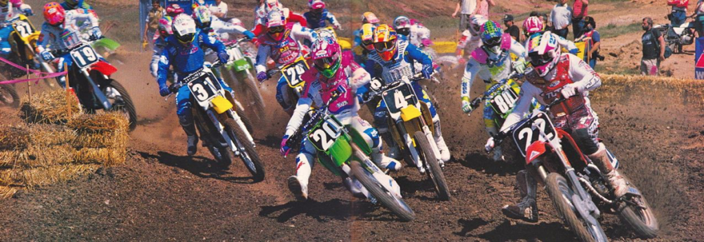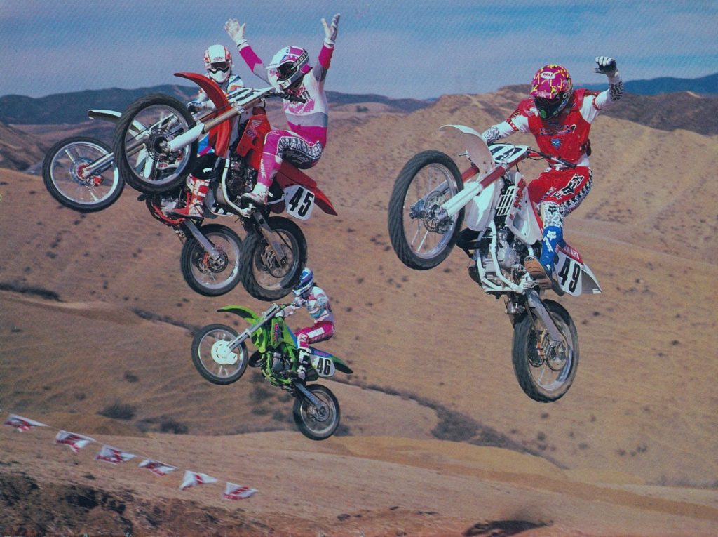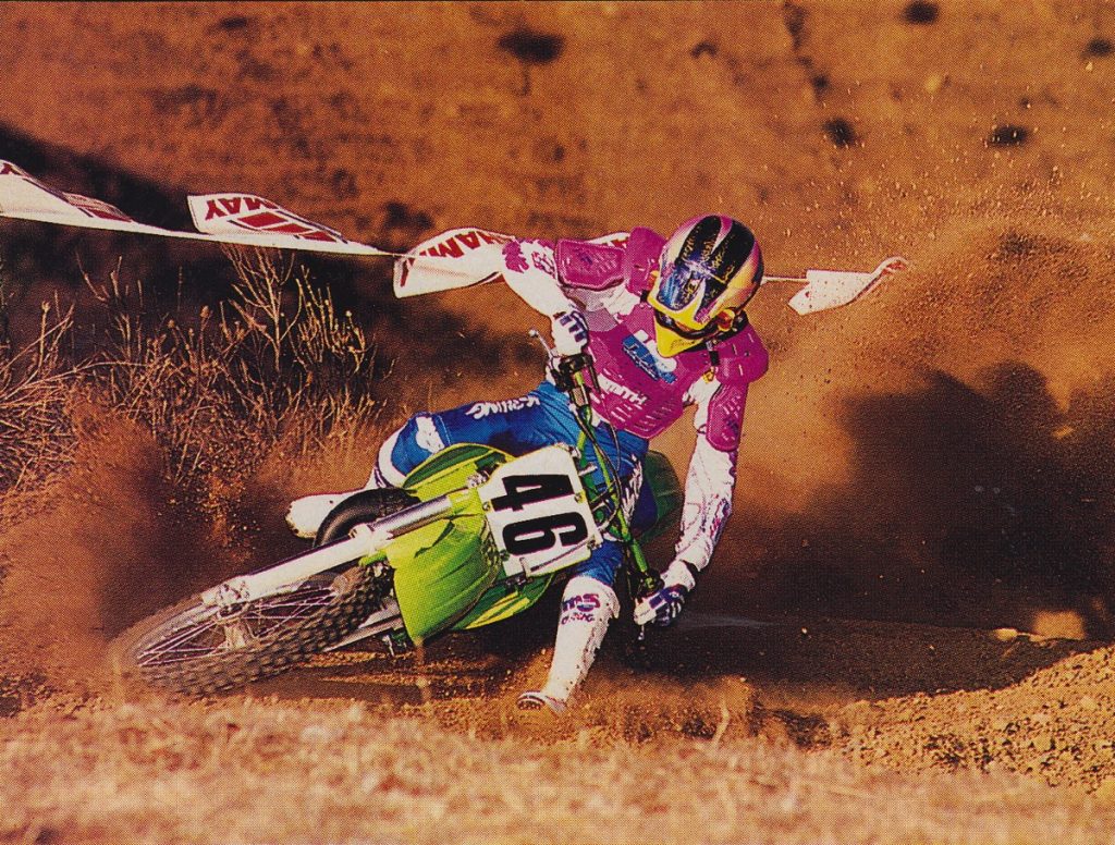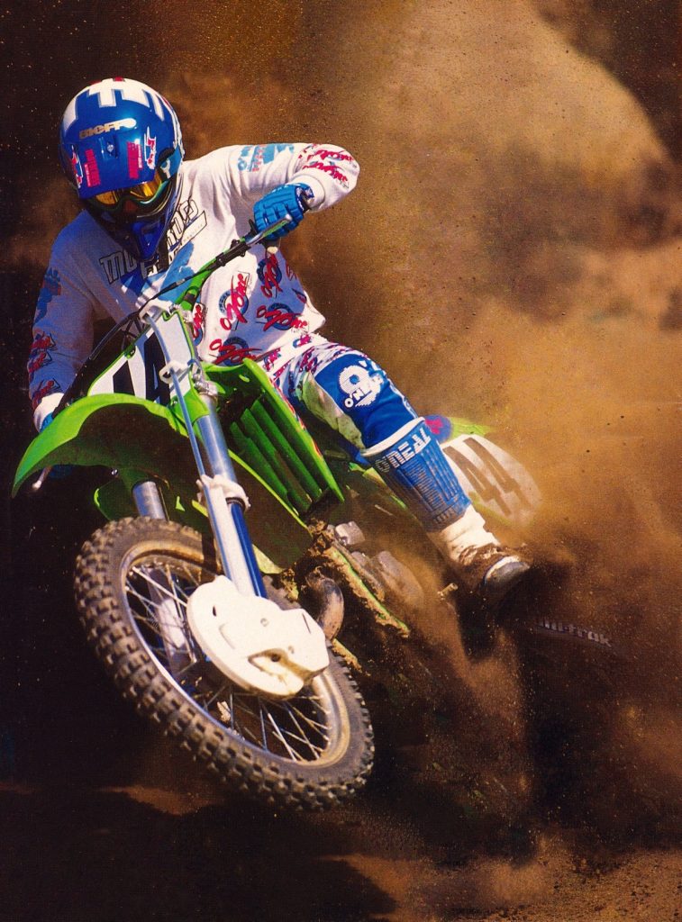 In 1989, KX pilots had been at a major power disadvantage to the other bikes in the class. In 1990, riders like Jeff Matiasevich (20) finally had the power to run at the front. Photo Credit: Dirt Bike