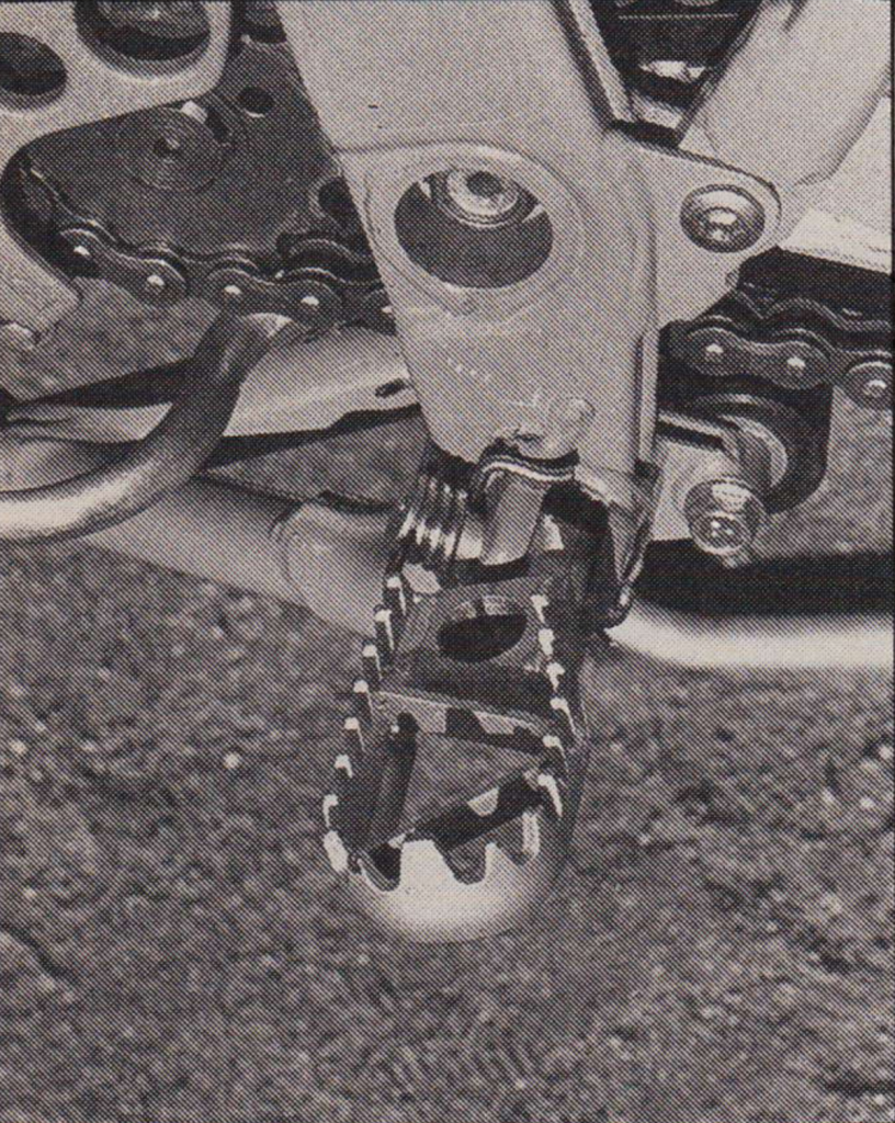 Ankle savers: Maybe the most long-lasting of the 1990 KX’s innovations was the introduction of these ultra-wide platform pegs to motocross. Photo Credit: MXA