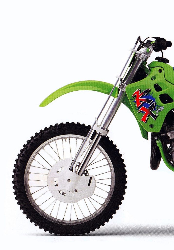 After the excellent 46mm conventional forks found on the ’89 KX, many riders were afraid the new model’s 41mm inverted KYBs would be a major step backward. Thankfully, those fears proved unfounded and the new KX turned out to have some of the best forks on the track in 1990. Photo Credit: Kawasaki