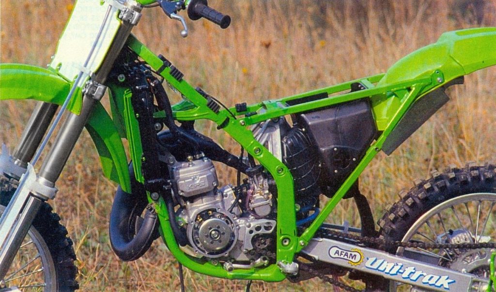 By far the most radical change on the 1990 KX was in the configuration of its frame. Borrowing liberally from the street world, Kawasaki designed an all-new steel frame that did away with a traditional backbone, in favor of two large spars that flanked the motor in a perimeter fashion. Photo Credit: Moto Revue