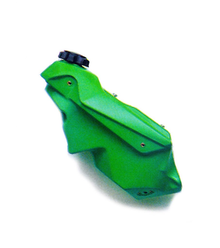 On the motor end, Kawasaki retained the same basic 124cc case-reed mill it had used since 1988, but made several important changes aimed at improving power. The first modification was a switch to a concave piston with a single ring for reduced drag and a cleaner burn. Then the KIPS (Kawasaki Integrated Power-valve System) was redesigned to eliminate the use of a variable exhaust port and instead only vary the position of the scavenging boost ports. The exhaust resonance chamber was retained and it remained in its prominent position on the outside of the cylinder. To improve combustion, a second coil was added and mated to a new microprocessor-controlled digital ignition. The carburetor remained a 35mm Keihin PKW, but a new “jet block” was added to the bottom of the venturi to reduce intake turbulence. Feeding the revised carburetor was a new larger air boot and airbox, with innovative shutters that could be opened and closed based on conditions to let in more air, or keep out water.