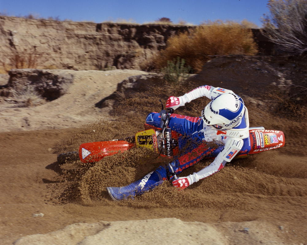 For a big and powerful bike, the ’87 CR500R was an absolute scalpel. Front wheel traction and steering feel were excellent, with more than enough power on tap to pull you through deep sand and loam with ease. As Rob Andrews demonstrates, the big Honda had what it took to carve mean arcs in 1987. Photo Credit: Fran Kuhn