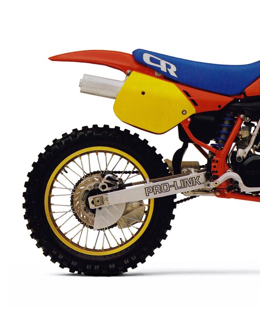 In 1987, no forks available in the Open class could come close to the performance of the CR’s 43mm Showa cartridge sliders. Even without adjustable rebound damping, these works-style forks crushed the competition with excellent control and a plush feel. Sadly, it would take Honda more than a decade to finally eclipse their performance. Photo Credit: Honda