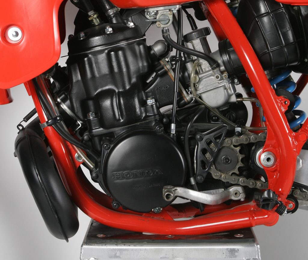 Unlike the complicated and high-tech KIPS (Kawasaki Integrated Power-valve System) found on the KX500, the Honda’s top end kept it simple with only liquid cooling and a bucket-sized piston employed to deliver its immense torque figures. Photo Credit: Honda