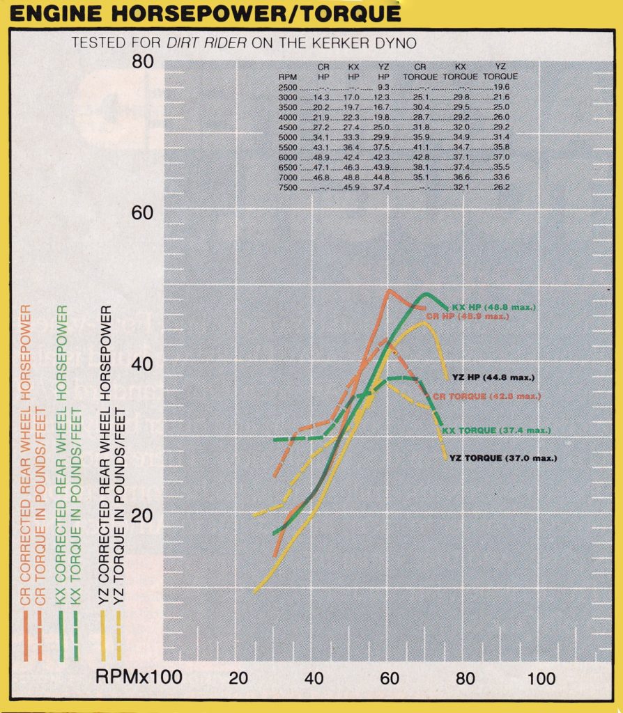 This dyno chart on the 1987 500s is full of interesting data. Firstly, it shows just how out out-powered the air-cooled Yamaha was against the competition at the time. It gave up four horsepower and almost six pound-feet of torque to the Honda. By comparison, the KX was much closer in horsepower (being edged out by only one-tenth of a pony), but still far behind in torque (37.4 vs. 42.8 pound-feet for the Honda). While we are on the subject of torque, it is worth noting that this thirty-year-old, stone-axe simple Honda two-stroke has no problem handily besting every modern 450 four-stroke in that department. While all of them blow away its relatively meager 48.9 horsepower figure (a modern 250F can actually come close to matching that), none of them can touch its massive 42.8 pound-feet of torque (most modern 450Fs put out torque figures in the mid-thirties). Since torque is actually the thing you feel when you crack open the throttle, you have a pretty good idea of just how dang fast this thing felt when you leaned hard on the loud-handle. Photo Credit: Dirt Rider