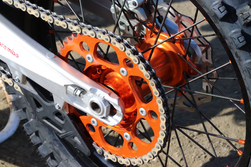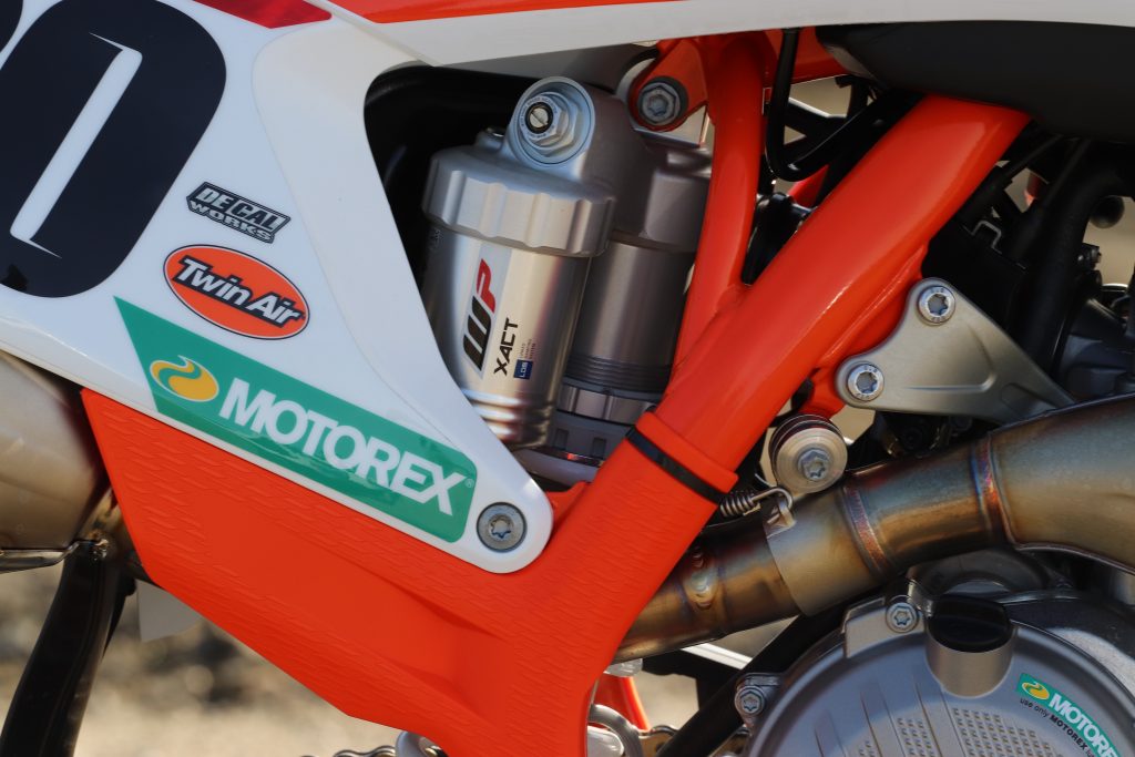 6-Lightweight Feel: You would think with an engine character that is so smooth down low and linear feeling that the orange machine would feel heavy on the track, but it feels quite the opposite. It’s light, flickable, and if you want to make a sudden line change, it can do that exceptional as well. Leaning into corners and keeping it leaned all the way through the corner is the KTM FE’s strong suit. No one in the class can beat an orange bike in this category.