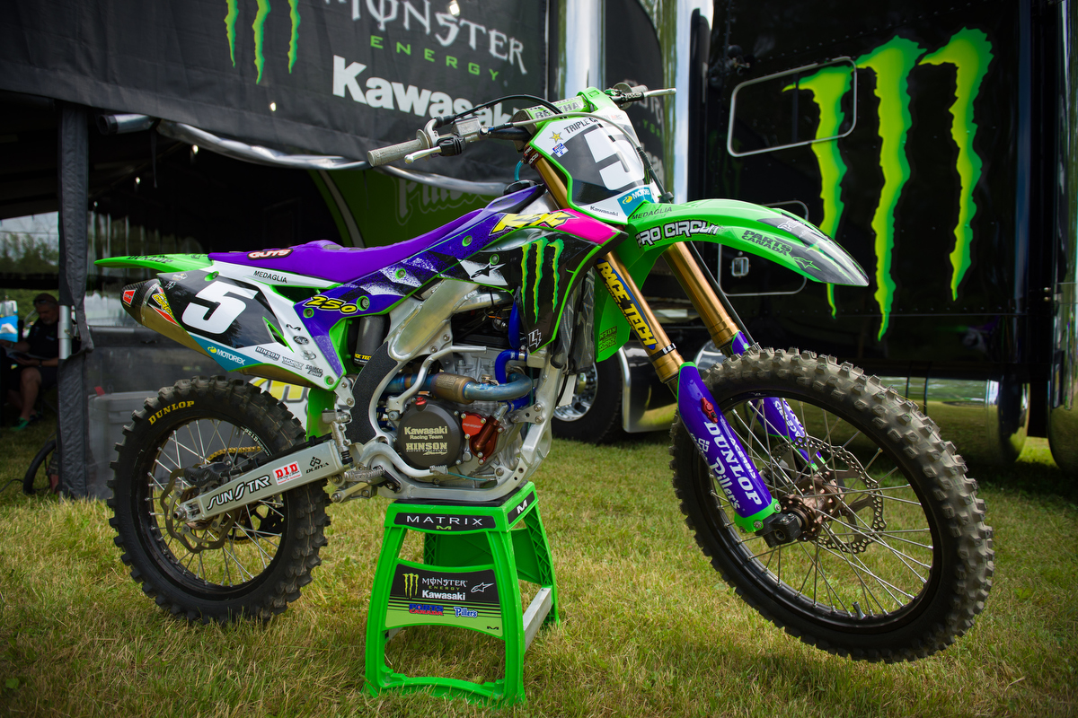 Though he’s based on the East Coast now, Tyler Medaglia grew up near the Sand Del Lee track and has turned a million laps here so for the past couple years the Monster Energy Alpinestars Pillers Kawasaki team likes to do a custom bike for his home race. This year they chose to go with a 96 KX theme.