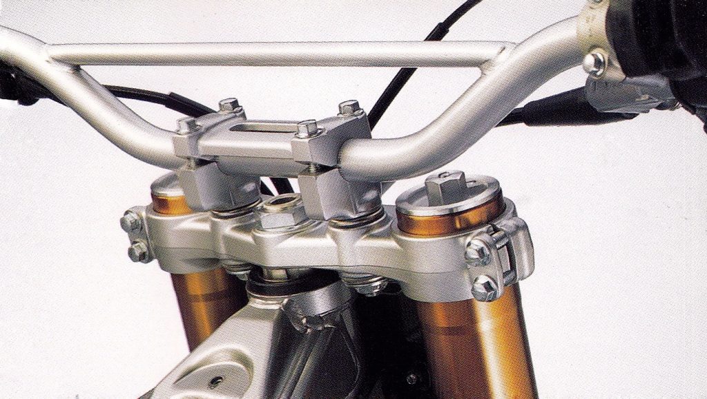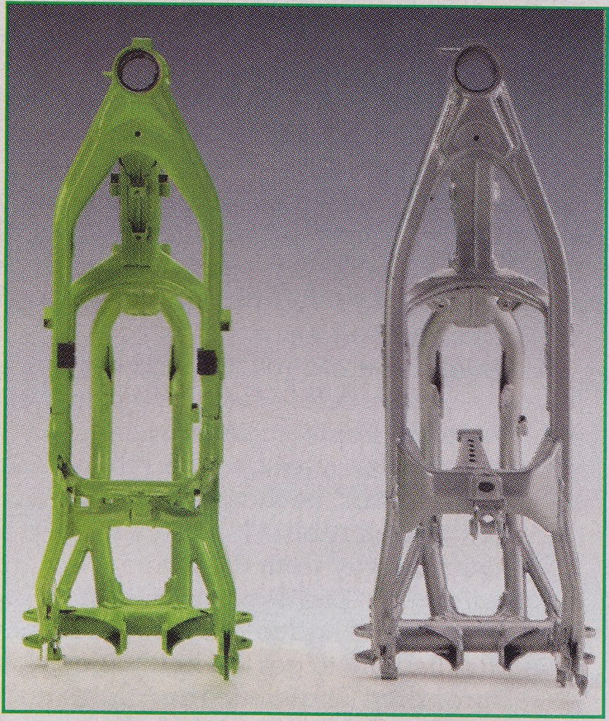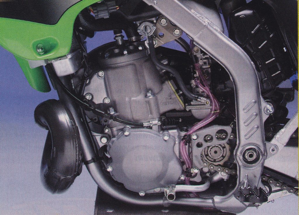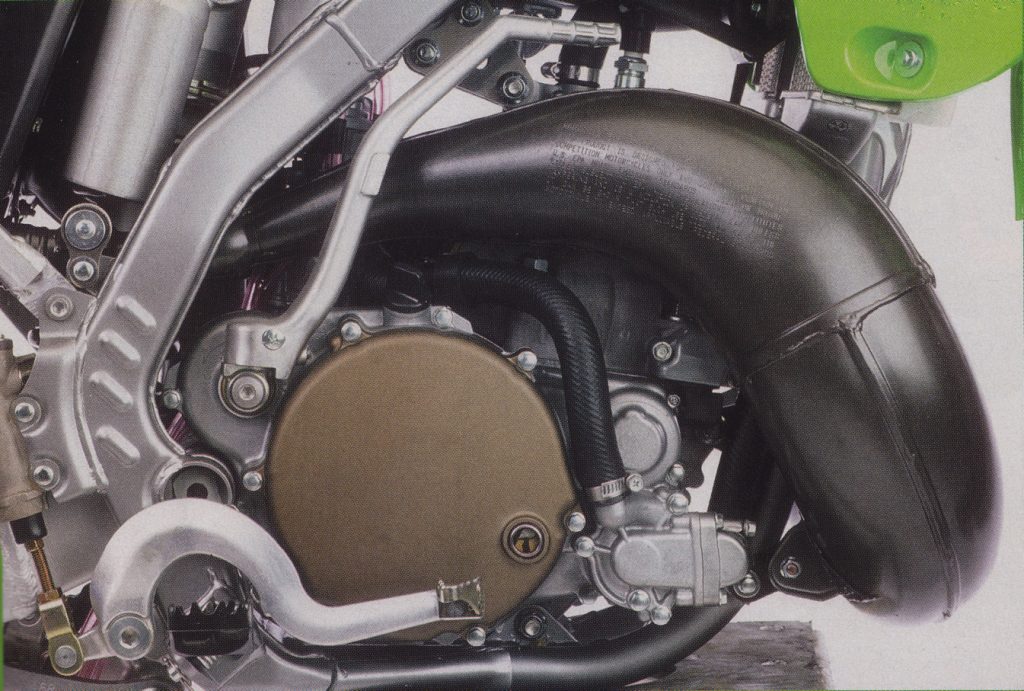 In 1990, Kawasaki became the first manufacturer to employ a perimeter frame for motocross. At the time, this now-ubiquitous chassis design was unproven in off-road use and quite a leap in technology. The perimeter chassis was ultra-stiff and far more resistant to torsional flex than a traditional frame. While strong, these early steel versions were also larger, heavier, and far bulkier than any of the single-backboned frames used by the competition.