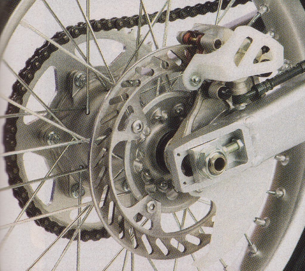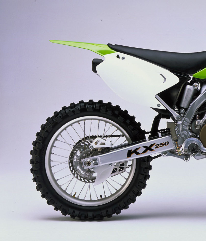 In addition to the new frame and linkage, new hubs were bolted on that were lighter and stronger, while featuring a larger axle (20mm to 25mm) in the rear for improved handling. The rear rotor was also increased in diameter (220mm to 240mm) to improve braking power. To offset any weight gain, the rotor was decreased in thickness and a new integrated rear master cylinder was employed that simplified packaging and saved a few additional ounces. Even the shock spring was redesigned for 2003 to save weight, with the new coil saving 300 grams (9 ounces) over 2002. Overall, all the weight-saving steps added up to a full four pounds being shed off the KX250 for 2003.