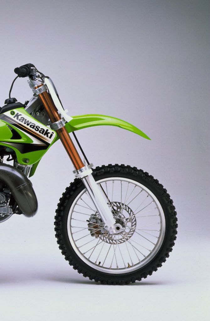 For 2003, the KX125 dropped the rather odd-looking shoulder-less rim it had used in 2002 and moved it over to the KX250. By 2005, this weird experiment in design would be retired to the ash heap of history. Photo Credit Kawasaki