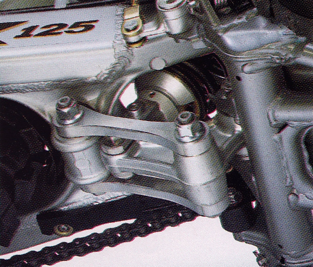 An all-new linkage on the KX125 and KX250 for 2003 lowered the ride height to increase traction and improve handling. Photo Credit: Kawasaki