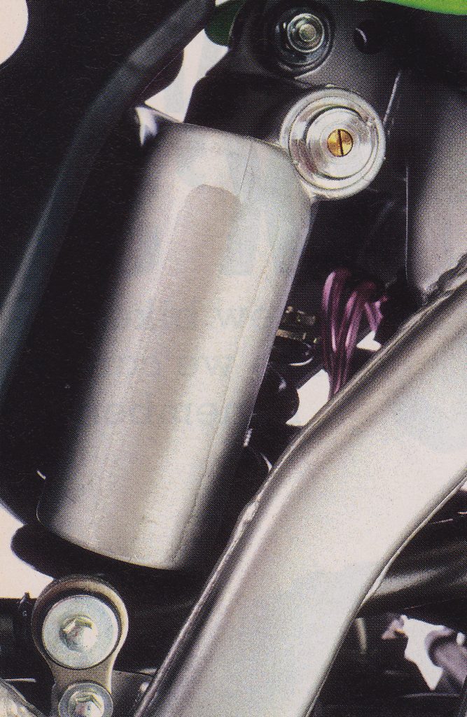 Back to basics: An all-new Kayaba shock for ’03 removed the separate high-speed compression adjuster to simplify tuning. Photo Credit: Kawasaki
