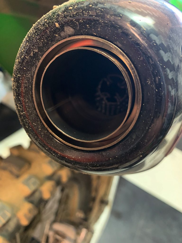 You want to know a tip? Don’t throw out that insert that comes with your FMF 4.1 muffler system! Why? Because I actually liked the SX Style headpipe/4.1 muffler system better with the insert in. Why? Because it gave the muffler some added back pressure and gave me some added RPM response without sacrificing a lot of mid range pulling power. With the insert in the muffler, the KX450 now has increased (0-10% throttle opening) low RPM throttle response that I was missing through mid corner and had better corner exiting power. With the insert in you also will get more connection to the rear wheel and more traction when the track gets firmer. The sound of the 4.1 muffler with the insert in is also more pleasant and isn’t as loud as the larger opening of the FMF 4.1. NOTE: Not all bikes respond to inserts/back pressure the same so just know that each bike is different. If you feel like you may need a little more low end throttle response from your FMF 4.1 muffler system, try the insert.