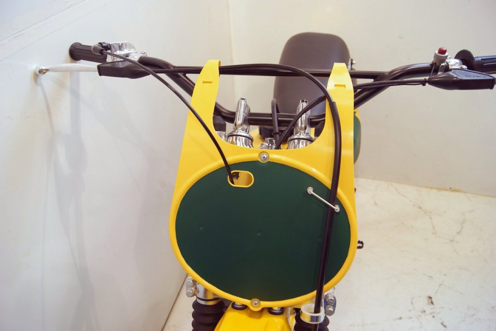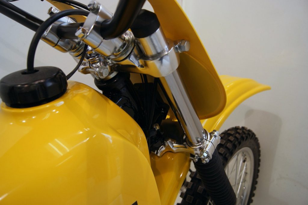 The new forks on the C-2 maintained the same 9.8-inches of travel of the C model, but offered more internal overlap (to decrease flex and binding) and an increase in air and oil volume. In order to accomplish this, Suzuki extended the top of the forks and redesigned the triple clamps to set the bars back and out of the way. Photo credit: Mecum