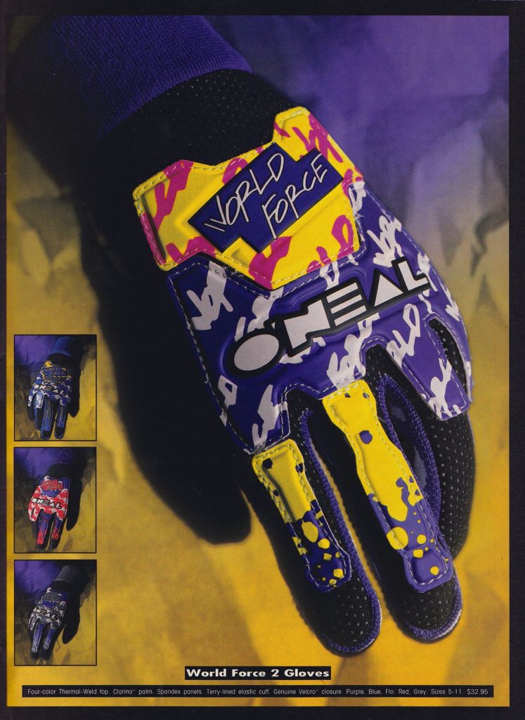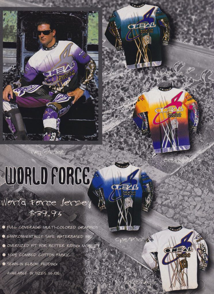 Blaze: LOVE, LOVE, LOVE the new World Force pants and jerseys for 1993. That pinstripe is a clear rip-off of AXO’s older 125ST pants but who cares? It looked great in 1991 and it still looks great here. If O’Neal updated the materials and re-introduced this design today these would sell out in a matter of hours. Stamp it!