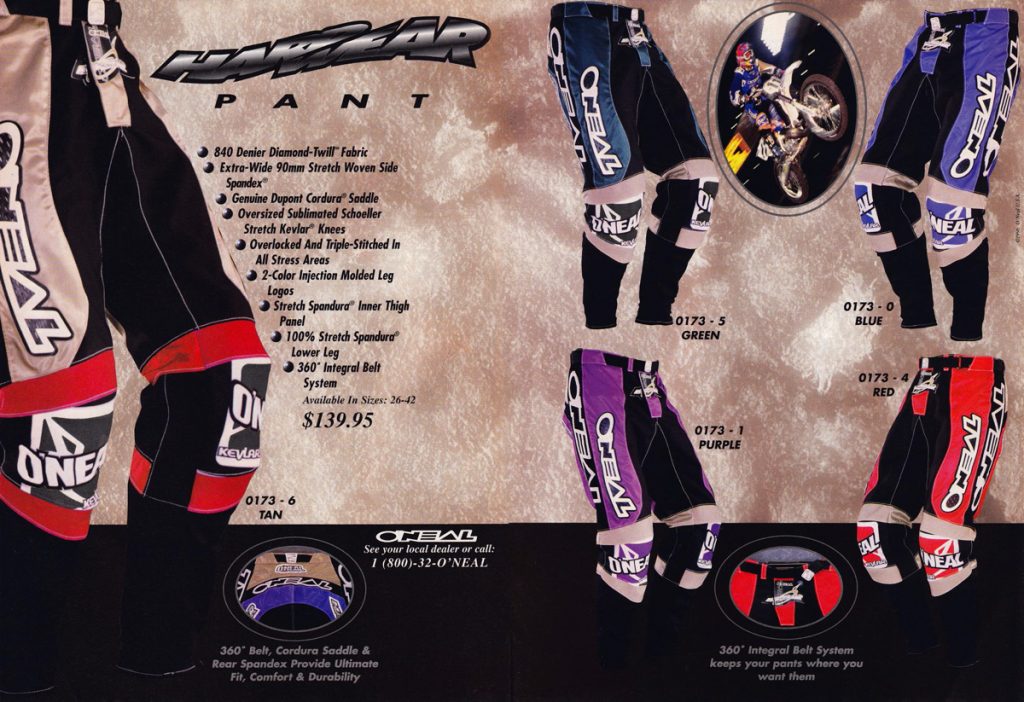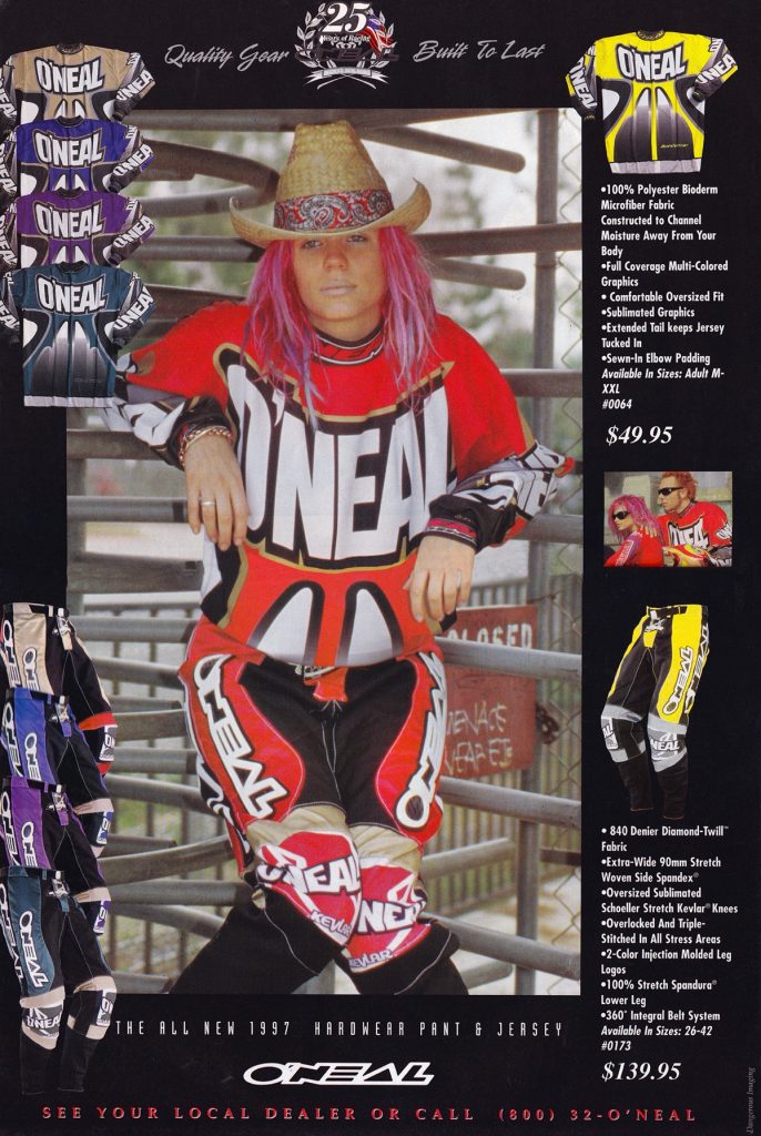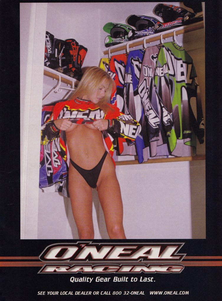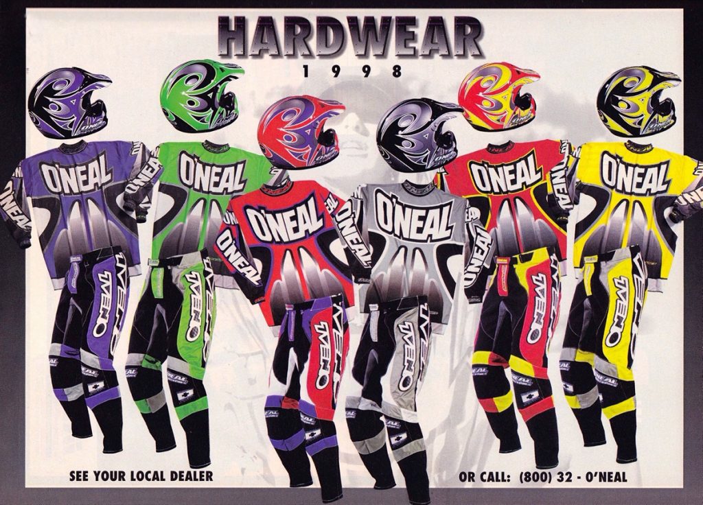 Blaze: In 1998, O’Neal started the tradition of having beautiful women in bikinis model their gear. Somehow, I think this was probably Jim Holley’s idea. Regardless of who thought of it, it guaranteed two things: 1) it would not ever appear in MXA, and 2) it would make it to the bedroom wall of every adolescent male with a RacerX or MX Racer subscription in North America. Call me crazy, but that is damn fine-looking gear.