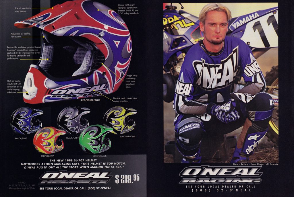 As we celebrate O’Neal’s fiftieth year in motocross, Matthes, Doug Dubach and I are back with another look at the gear that has made O’Neal a staple of tracks around the country over the last five decades. For this installment, I have combed through my thousands of magazines to find all of O’Neal’s classic motocross ads from the 1990s. Easily my favorite era for moto, the nineties were awash in colorful gear and even more colorful personalities.