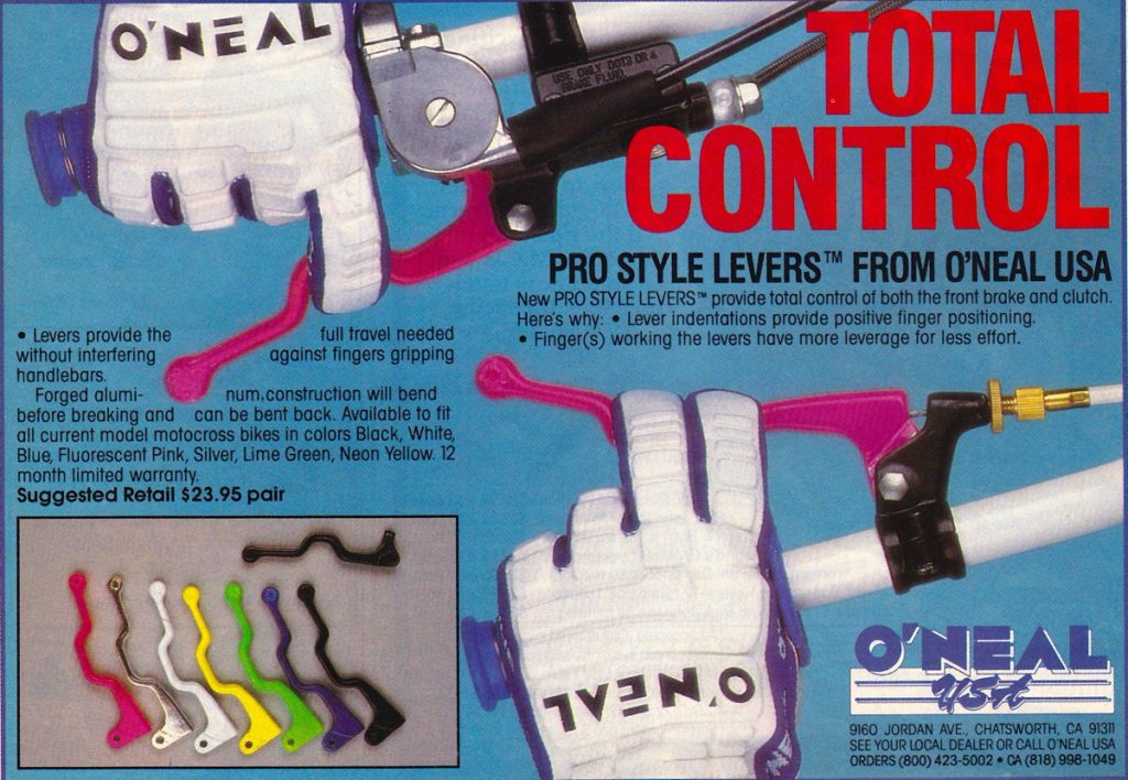 Blaze: While not gear specifically, I think it is worth mentioning this little blip on the moto landscape that O’Neal introduced in 1990. These Pro Style Levers came in cool colors and seemed like a good idea. They supposedly offered increased control and no worrying about crunching your fingers. Of course, I had to get a set and of course, they were weird to use and less practical than one would think. I never really came to grips with their odd feel and ditched them in short order.