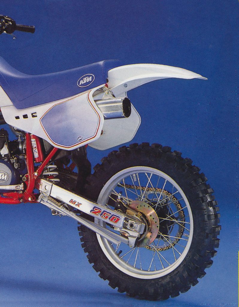 In the rear the ’87 KTM employed a high-dollar White Power “Super Adjuster” shock that offered seven adjustments for compression and eleven for the rebound. Unlike the front forks, this unit was set up well and in the ballpark for most users. Other than a slightly quick rebound, this was one of the better rear ends of 1987. Photo Credit: KTM