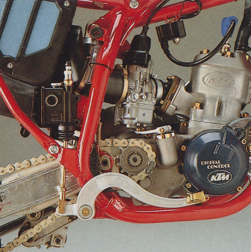 On the motor side, KTM pulled out all the stops in 1987 with an all-new “Power Valve” design that looked to boost performance to the front of the class. In 1986, the buzz word at KTM had been Digital Control Ignition. This microprocessor-enhanced ignition had been employed to allow the motor’s spark timing to more closely follow the engine’s power curve. Instead of advancing timing at a set rpm, the new DCI minutely changed the park advance constantly to best match the needs of the motor.
