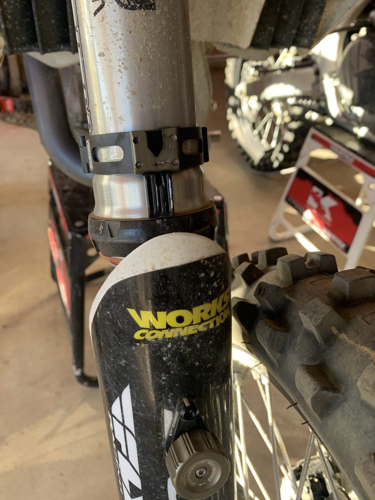 Once all of those tools are laid out, it took us around 20 minutes to install the SELA device on our Husqvarna FC450. When setting your fork ring make sure to only snug the bolt to ensure proper alignment with the SELA knob on the fork guard. Once set and the fork ring catches the knob, tighten the fork ring bolt to specified torque setting. We liked to set our SELA at 140mm on the fork guard