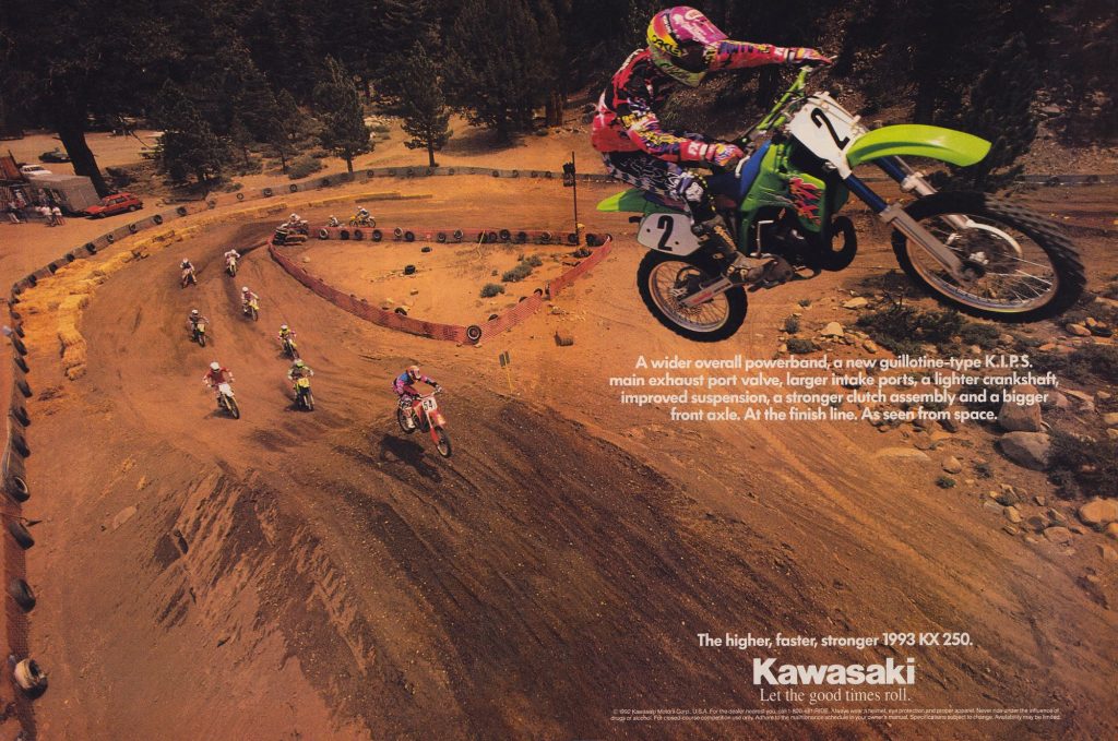 For this edition of Classic Ink, we are going to take a look back at an ad for Kawasaki’s high-flying 1993 KX250.
