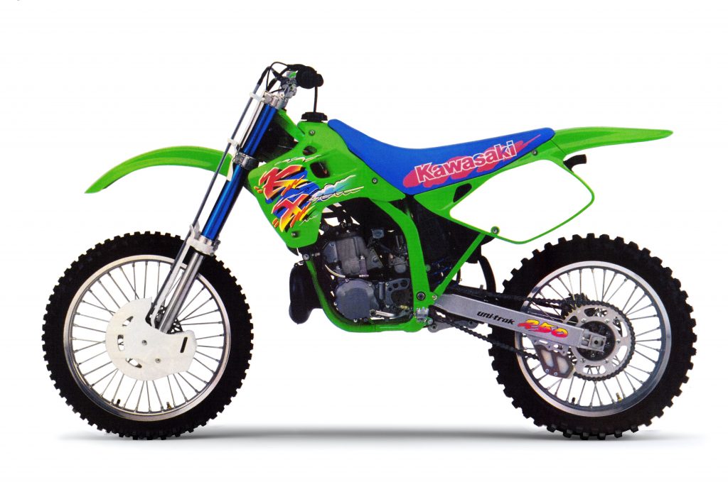 In the early 1990s, motocross was on a neon-induced high. The gear, the bikes, the riders, and even the ads were all larger than life and absolutely popping with color. On the bike side, the first machine to make this jump to outlandishness had been normally conservative Kawasaki. In 1990, they had shed their dowdy image with the introduction of their ground-breaking new perimeter-framed KX250 and KX125. With their Ninja-inspired frames, cartoon graphics, and Buck Rogers bodywork, the new KXs kicked off an era where purple and pink would become colors du jour in the halls of Japanese industrial design.