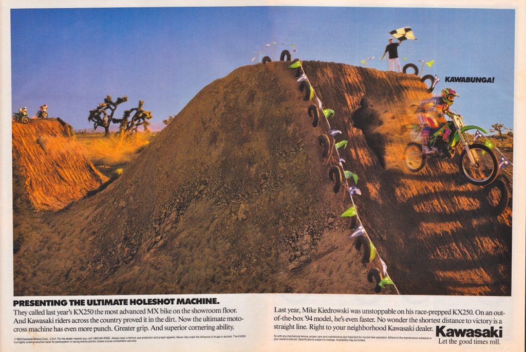 In order to promote this new bolder look, Kawasaki enlisted their boldest rider (who ironically was moving to Suzuki for 1993); Jeff “Chicken” Matiasevich. In the ad, Chicken is utterly launching the new KX into orbit as if they had added a rocket booster instead of just a new KIPS valve for 1993. When I first saw this ad, my jaw literally dropped to the page. While Jeff was certainly more than capable of executing a moon-shot like this, I have always assumed this photo was some sort of pre-photoshop trickery. I remember having this debate with buddies back then who swore he was legit launching the bike this high. Just looking at the takeoff to this jump it seems implausible to me he could get this high, but of course, I didn’t really know any more than they did. Either way, the ad certainly had the desired effect of generating a ton of buzz for a bike that was essentially a mild refresh with some Bold New Graphics. As soon as this ad hit the mags it was torn out and plastered on bedroom walls, lockers, and workshops all across the country. At the time, I was in school and working part-time at the drive-thru at a bank. Both myself and the other teller were huge MX fans and we plastered this ad on the wall in my little remote teller booth and I can’t tell you how many people asked me about this picture. Something about it captured the attention of even non moto-lovers and the first question was always “is it real?”