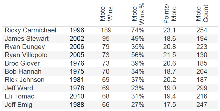 Below is the Top 10 all-time moto wins list. I’ve also added a few other metrics, Win % and Points/Moto, to help fuel the bench racing fire. Beyond Ricky Carmichael dominating the list, I found it particularly interesting to see how Broc Glover and Rick Johnson jump up the list when you rank based on Moto Win % and Points/Moto. What do you see that’s interesting?!