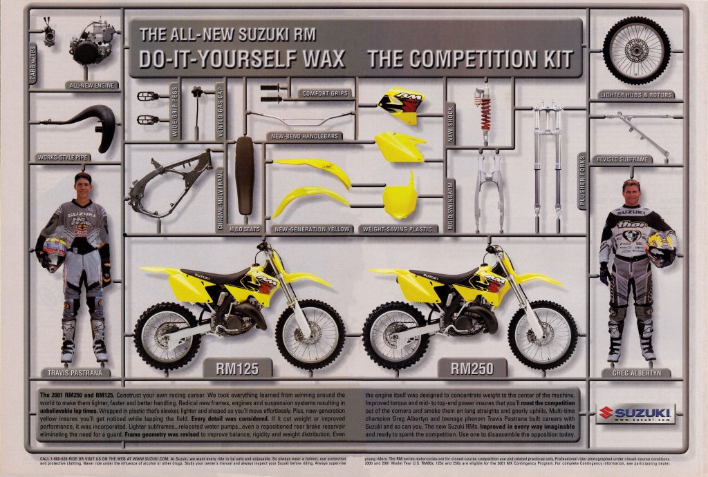 1. Hey Tony thanks for the reviewing the 2001 RM125! I have owned a new 2003 and 2006 RM125 and they are great bikes. It is good to see the RM125 get some love after reading the reviews MXA gave it during this time. In one breathe they say that Suzuki RM125 hit a home-run with this bike and in the next breathe they dog it, it doesn’t make sense to me. I have ridden a 2003 YZ125 and my 2003 RM125 back to back and neither the owner of the YZ125 or myself could see the difference in the power and I am a vet A rider who has raced for many years. Again, thanks for the honest review!