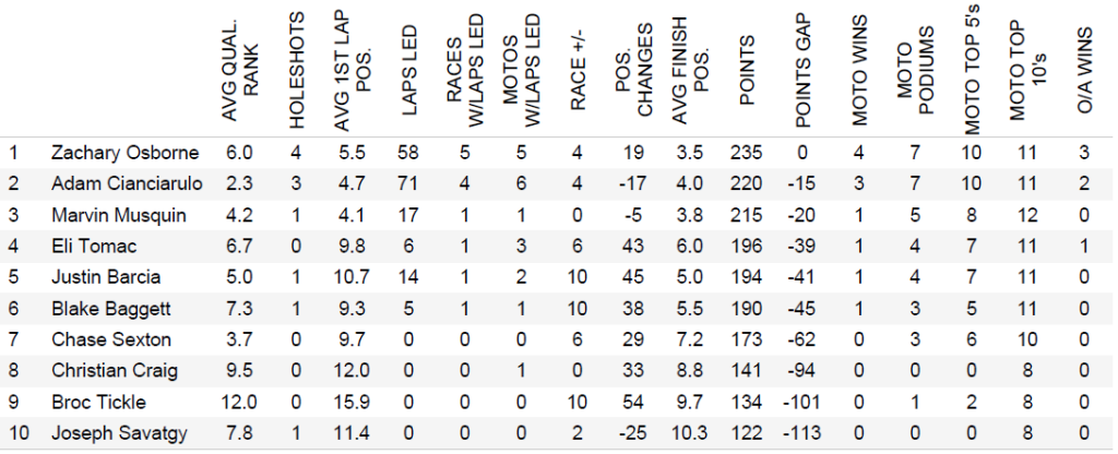 Not only are they sitting 1st and 2nd in the championship, but they are dominating almost every single race statistic. For starters, they account for 5 of 6 overall wins and 7 of the 12 moto wins. No other rider has multiple overall or moto wins. As you can see from the table below, they have the most holeshots, rank 2nd and 3rd in 1st lap position, have led laps in the most motos, rank 1st and 3rd in average finish position, and have the most moto wins/podiums/Top 5/Top 10’s. Osborne, Cianciarulo, and to a degree Sexton, have very clearly signaled they are here to contend for wins and championships.